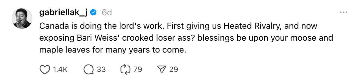 In a huge month for Canadian wins, Bari Weiss finally got called out in a major way after she pulled a 60 Minutes segment on CECOT Prison at CBS News in the U.S., but not before it was syndicated to Canadian streaming. When it aired, Canadians captured and shared the segment on social media. Insiders at CBS then shared investigative journalist Sharyn Alfonsi’s email to staff (which I recommend reading), outlining that she believed Weiss’ decision to be political, not editorial. Weiss — who despite her position as head of a major news network, has no previous broadcast experience — has defended her decision in a statement: “My job is to make sure that all stories we publish are the best they can be. Holding stories that aren’t ready for whatever reason — that they lack sufficient context, say, or that they are missing critical voices — happens every day in every newsroom. I look forward to airing this important piece when it’s ready.”