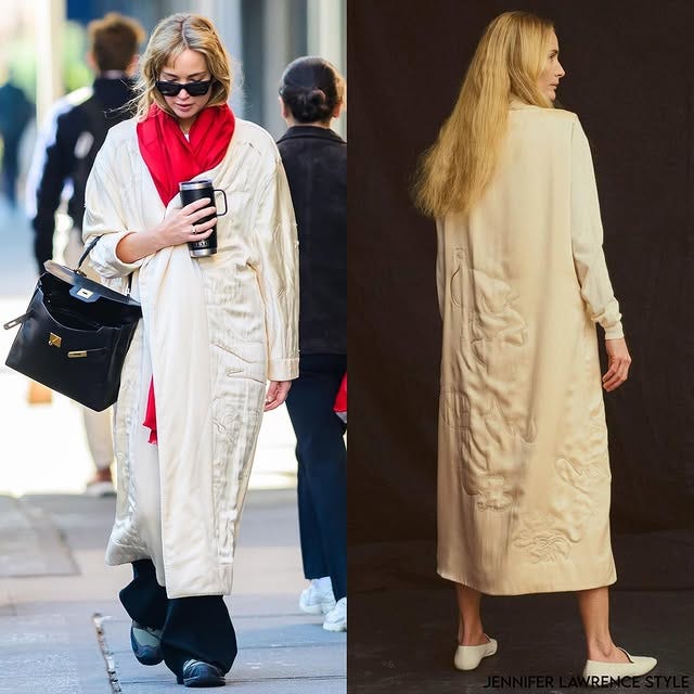 October 14: Okay, this is more than a week ago, but Jennifer Lawrence wore the Salomon XA Pro Distressed Leather Sneakers with an Hermès Kelly. Because I’m now 10 months away from turning 30 and browsing Park Slope one bedrooms on Streeteasy daily, I feel called to buy these hikers and recreate Lawrence’s high-low, elegant meets “I actually do live in the world and have to run errands” energy. Step one was taking the Tom Ford-era Gucci bag I bought months ago for $108 (the greatest steal of my LIFE and my version of Lawrence’s Kelly) to Jim’s Shoe Repair for a clean up. I’ll show you when I get it back!